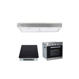 Tricombo campana extractora estandar de pared en acero inoxidable 60cm + Parrilla de inducción magnética con 2 quemadores 110v + Horno eléctrico empotrable 60cm E-Motrix acero inox.