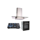 Tricombo Campana extractora análoga para cocina de pared en acero inoxidable y cristal templado recto de 90 cm + Parrilla de cristal templado empotrable de gas con 4 quemadores 60cm + Horno eléctrico empotrable adaptable para gas natural o LP de 60cm Motrix